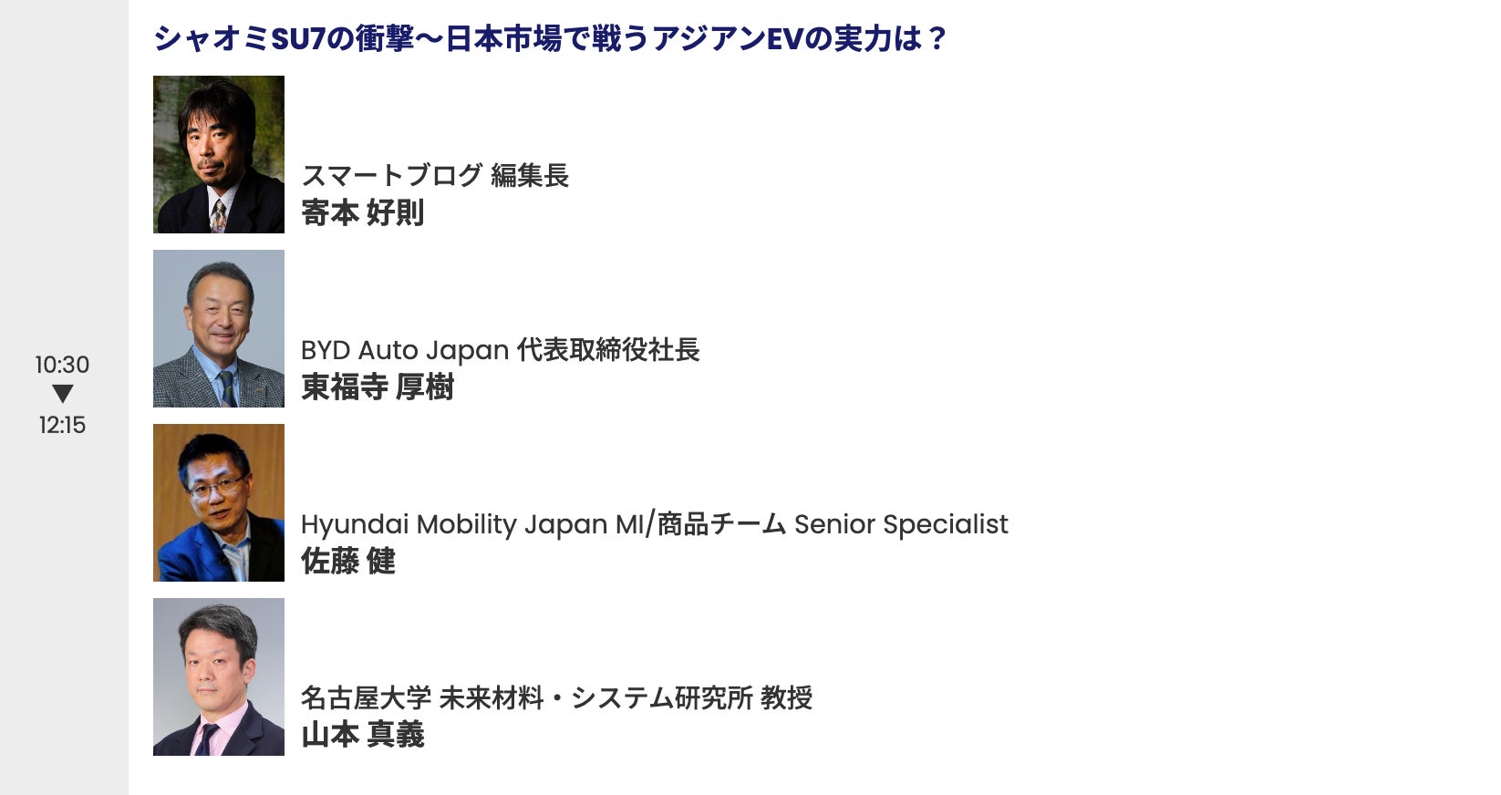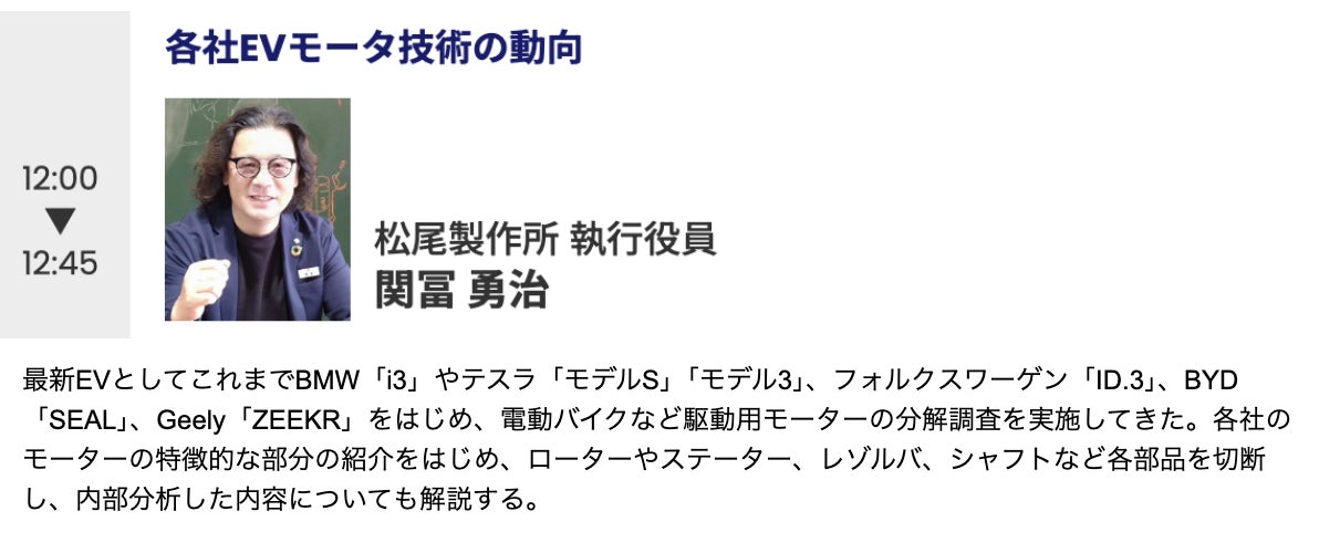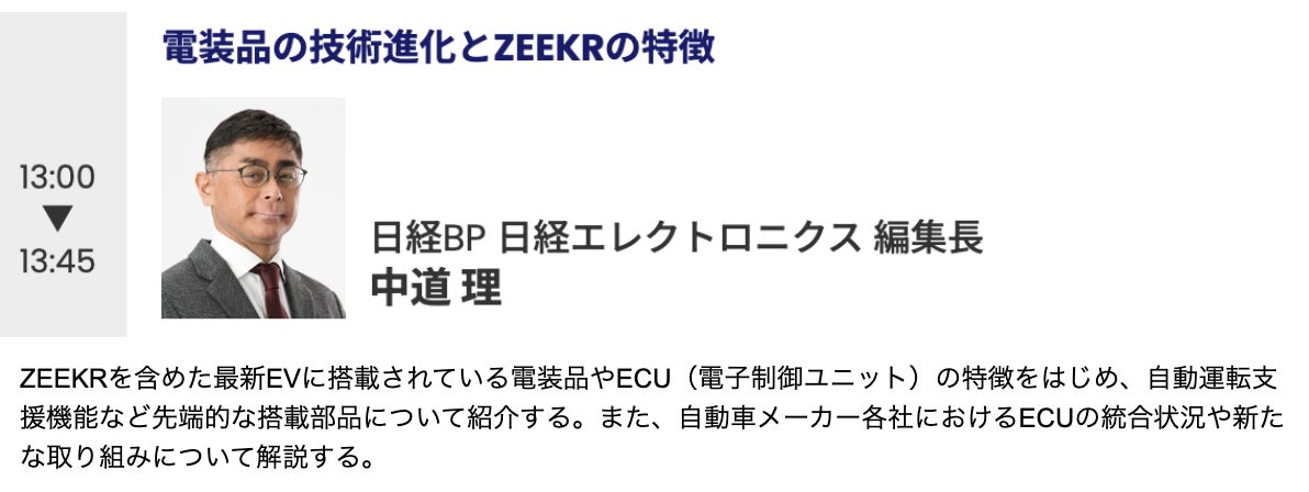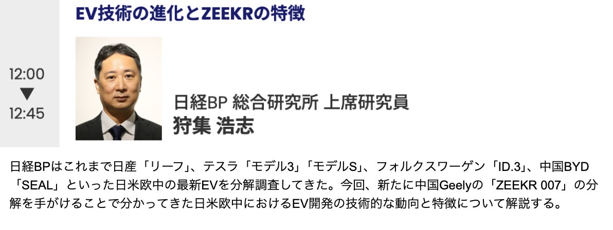 日本未発売の“スマホメーカー(Xiaomi)のEV SU-7”の実車展示や、中国Geely(吉利汽車)の最新EV「ZEEKR 007」分解展示など、業界最先端の技術を展示いたします。また、激動するEV業界についての最新動向やトレンドなど、企画に合わせたセミナーも多数開催いたします。