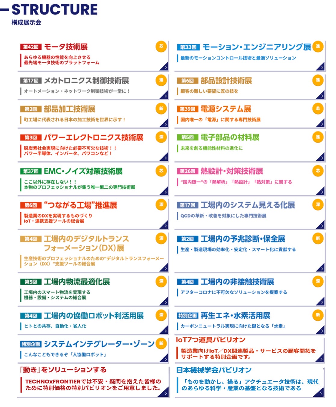 国内唯一の「モータ技術展」や「電源システム展」を有するTECHNO-FRONTIERは、全22の展示会で構成されています。そのため、専門分野だけでなく、関連業界の情報や最新技術、業界動向なども合わせてご覧いただくことができます。